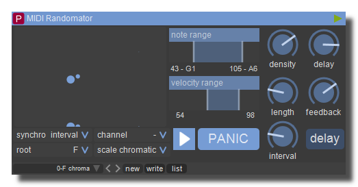 Generates random MIDI notes following a random-law-generator and several MIDI parameters.