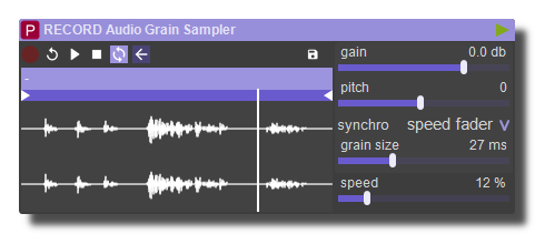 Grain size (duration) in ms. For small sizes, you obtain a good time resolution but it creates audio artifact's. For normal utilization set it to 30-50 ms.