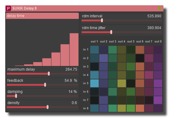 Surround panner delay with 1 input up to 8 outputs, where you can randomize the delays and their intensities.