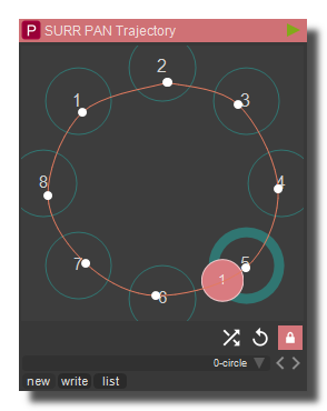 Classic surround panner with 1 or 2 inputs and up to 8 outputs witch use a trajectory module to draw the path.